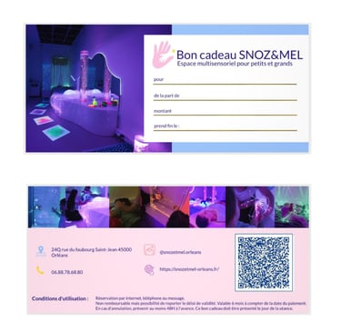 Une fois le code cadeau reçu par mail, merci de le transpmettre par mail et me donner vos disponibilités pour une remise en mains propres du bon cadeau cartonné, chez SNOZ&MEL.